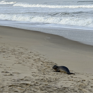 We don't do well with the bitter cold around here and by bitter cold, I mean 45 degrees! The thing about the Outer Banks winters isn't really the temperature... it's the wind! The ocean breeze that is refreshing in the Summer becomes an icy cold wind that can take your breath away. The winter also brings seals to our shores as they come to the sand to rest. This week I was lucky enough to see an adorable baby seal resting in Kitty Hawk. We also had some resting seals in Nags Head and Rodanthe so they were making lots of headlines around town! There is something so amazing about seeing these beautiful creatures in person. It is most important to note that if you have the honor to see a resting seal, you must stay at least 150 feet away so that you don't spook it. Seals can carry herpes and rabies so you absolutely don't want to try to touch it or help it. Just call the Marine Life folks and they will come out! You have to check out this Instagram video of this little guy coming ashore. He was estimated to be 9 weeks old... I'm calling him a he but I was told by a NEST volunteer that they don't know gender at this young age. She also told me that baby seals wean from their mamas around 4-6 weeks and from that point on, they are often on their own! Break my heart, why don't ya! I found this website with lots of great answers because I just can't give the info out fast enough. Anyway, peep this video and photos from my iPhone below. Eloise and I just really wanted to snuggle this pup, especially with how cold it has been. Somebody needs to give this sweet baby a swaddle and a baba, am I right? <3